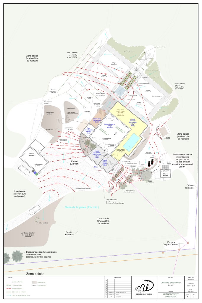 La gestion du ruissellement a été au cœur de notre intervention. Nous avons élaboré des plans de chantier détaillés et mis en œuvre une stratégie efficace pour gérer le surplus d’eau. Un jardin de pluie a été conçu près de l’allée automobile pour agir comme une zone de percolation. De plus, des zones de plantation stratégiques ont été créées autour de la résidence, et nous avons planifié les zones à déboiser pour optimiser l’espace.